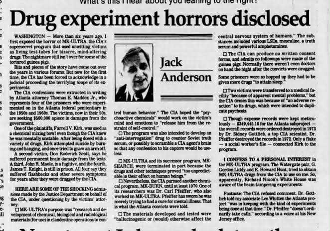 ภาพนี้เป็นส่วนหนึ่งของหนังสือพิมพ์ที่พาดหัวข่าวว่า "Drug experiment horrors disclosed" (ความสยองขวัญจากการทดลองยาถูกเปิดเผย) ซึ่งรายงานเกี่ยวกับการเปิดโปงโครงการลับของ CIA ชื่อ MK-ULTRA โดยเนื้อหาบรรยายถึงการที่ CIA ใช้การทดลองยาและสารหลอนประสาทต่างๆ เช่น LSD เพื่อควบคุมจิตใจและสร้างความทรมานให้กับผู้ต้องสงสัย