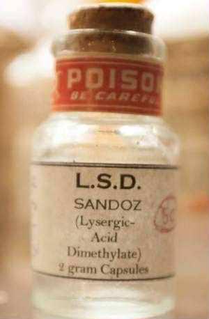 ภาพของขวดบรรจุสาร L.S.D. ของบริษัท Sandoz ขวดนี้มีฉลากกำกับชื่อเต็มว่า Lysergic-Acid Dimethylate และมีคำเตือน POISON พร้อมกับข้อความ BE CAREFUL อยู่บนแถบสีแดงที่คอขวด