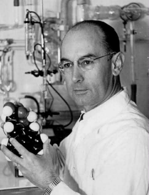 นักเคมีชาวสวิส อัลเบิร์ต ฮอฟมันน์ ถือแบบจำลองโมเลกุลของ LSD ซึ่งเป็นสารที่เขาค้นพบและสังเคราะห์ขึ้นในปี ค.ศ. 1938 และค้นพบฤทธิ์ทางจิตในปี ค.ศ. 1943 โดยบังเอิญ