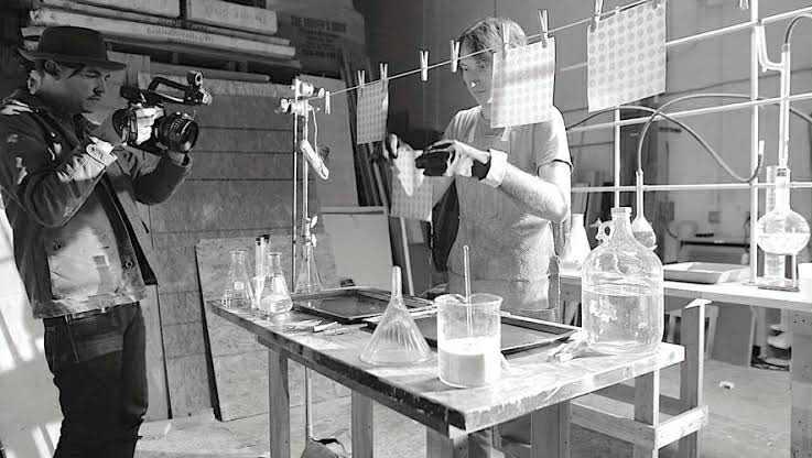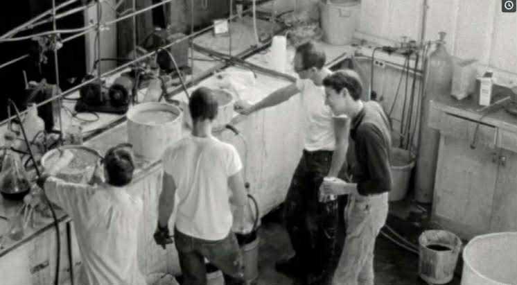 ภาพนี้เป็นฉากหนึ่งจากภาพยนตร์สารคดีเรื่อง "The Sunshine Makers" ที่บอกเล่าเรื่องราวของนักเคมีใต้ดินอย่าง Nicholas Sand และ Tim Scully ซึ่งโด่งดังจากการผลิตสาร LSD คุณภาพสูงจำนวนมหาศาลในช่วงปี 1960 โดยภาพนี้แสดงให้เห็น Nicholas Sand กำลังถ่ายทำ Tim Scully ในห้องแล็บของพวกเขา