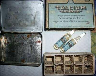 ภาพนี้แสดงกล่องยา Calcium Sandoz แบบโบราณ ซึ่งมีลักษณะเป็นกล่องดีบุกและกล่องกระดาษที่บรรจุหลอดยาแก้ว โดยเป็นผลิตภัณฑ์ของ บริษัท Sandoz ที่มีชื่อเสียงด้านการผลิตยาชนิดต่างๆ