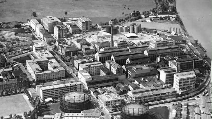 ภาพนี้คือมุมกว้างของโรงงาน Sandoz Chemical Works ในเมืองบาเซิล ประเทศสวิตเซอร์แลนด์ ซึ่งเป็นสถานที่ที่ อัลเบิร์ต ฮอฟมันน์ ค้นพบ LSD ในปี 1938 และเป็นที่ที่เขาได้เริ่มการทดลองโดยบังเอิญในปี 1943