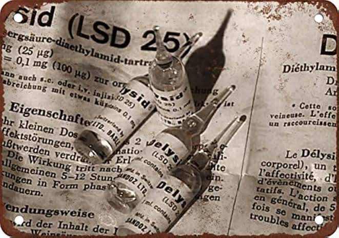 ภาพแผ่นสังกะสีโบราณนี้เป็นโฆษณาสำหรับยา Delysid หรือ LSD-25 ที่ผลิตโดยบริษัท Sandoz ซึ่งเคยถูกใช้ในการบำบัดทางจิตเวชในช่วงก่อนที่จะถูกสั่งห้าม โดยแสดงให้เห็นถึงขวดยา LSD ที่วางอยู่บนเอกสารโฆษณาที่เป็นภาษาเยอรมันและฝรั่งเศส