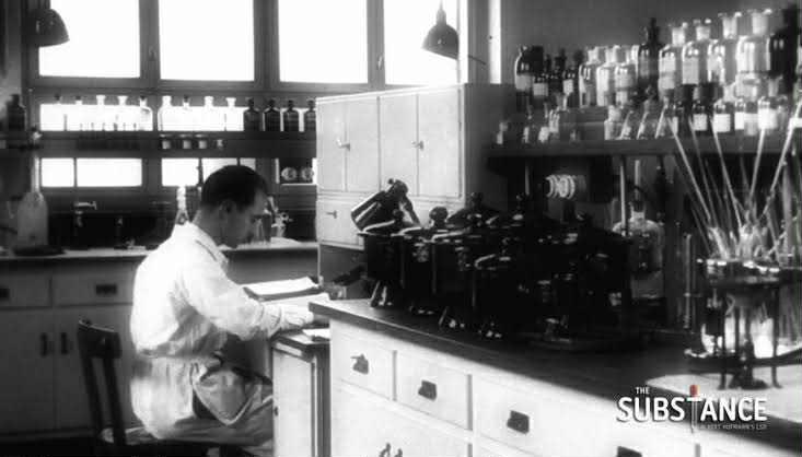 ในภาพคือ อัลเบิร์ต ฮอฟมันน์ กำลังทำงานในห้องแล็บของ บริษัท Sandoz โดยฉากนี้เป็นช่วงที่เขากำลังสังเคราะห์สาร LSD ก่อนจะค้นพบว่าสารนี้มีฤทธิ์ทางจิตในปี 1943 โดยบังเอิญ